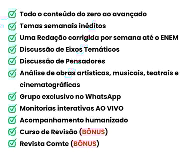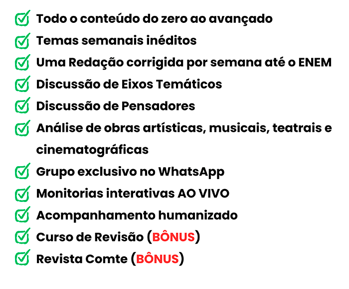Todos esses tópicos estão disponíveis em nosso curso para você começar hoje mesmo. Mas você terá ainda encontros semanais ao vivo comigo para tratar de todos esses assuntos; teremos produção de redação ao vivo, discussão de eixos temáticos e outras áreas do conhecimento, análise de temas, correções de redação, tudo com muita profundidade e zelo.